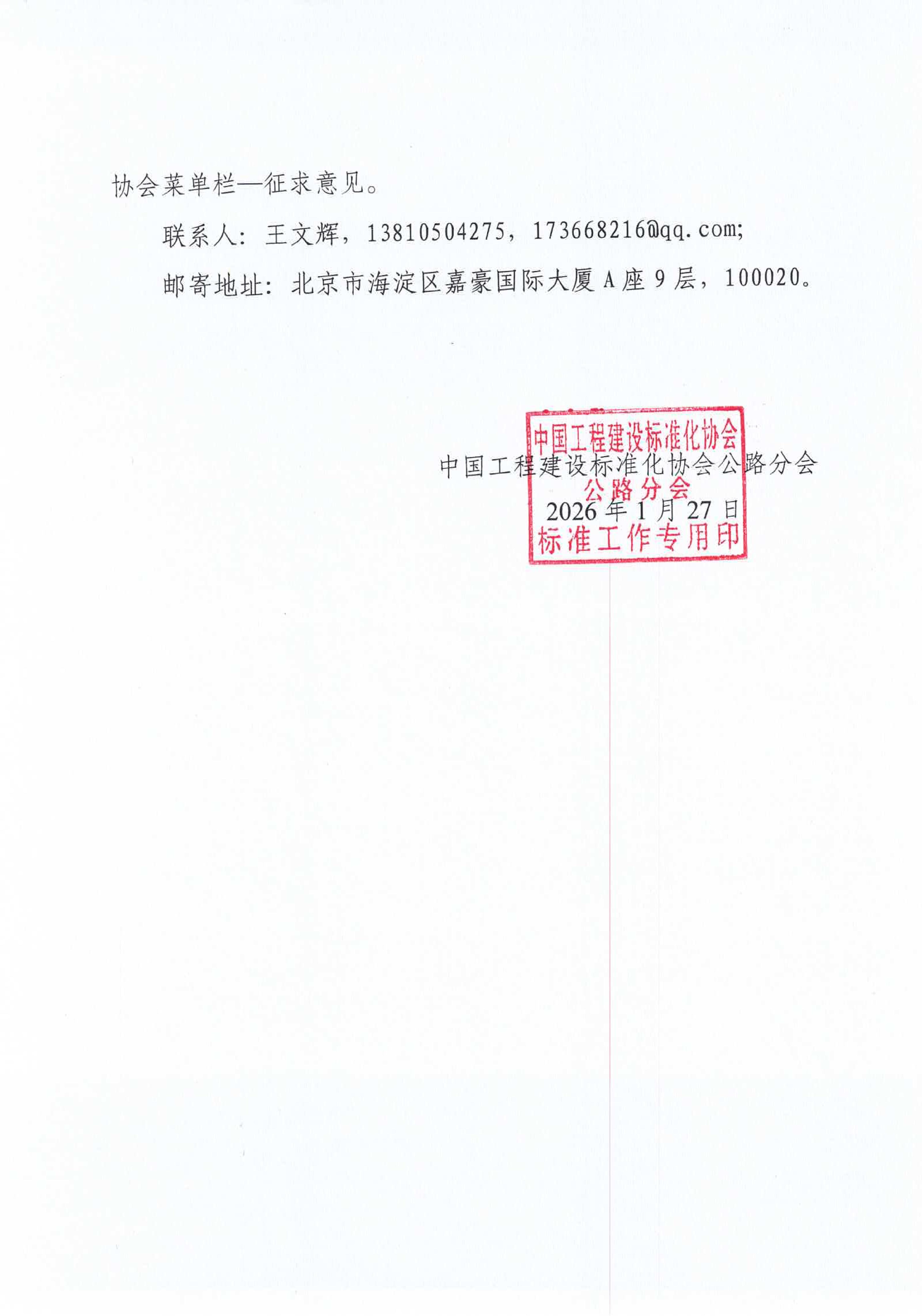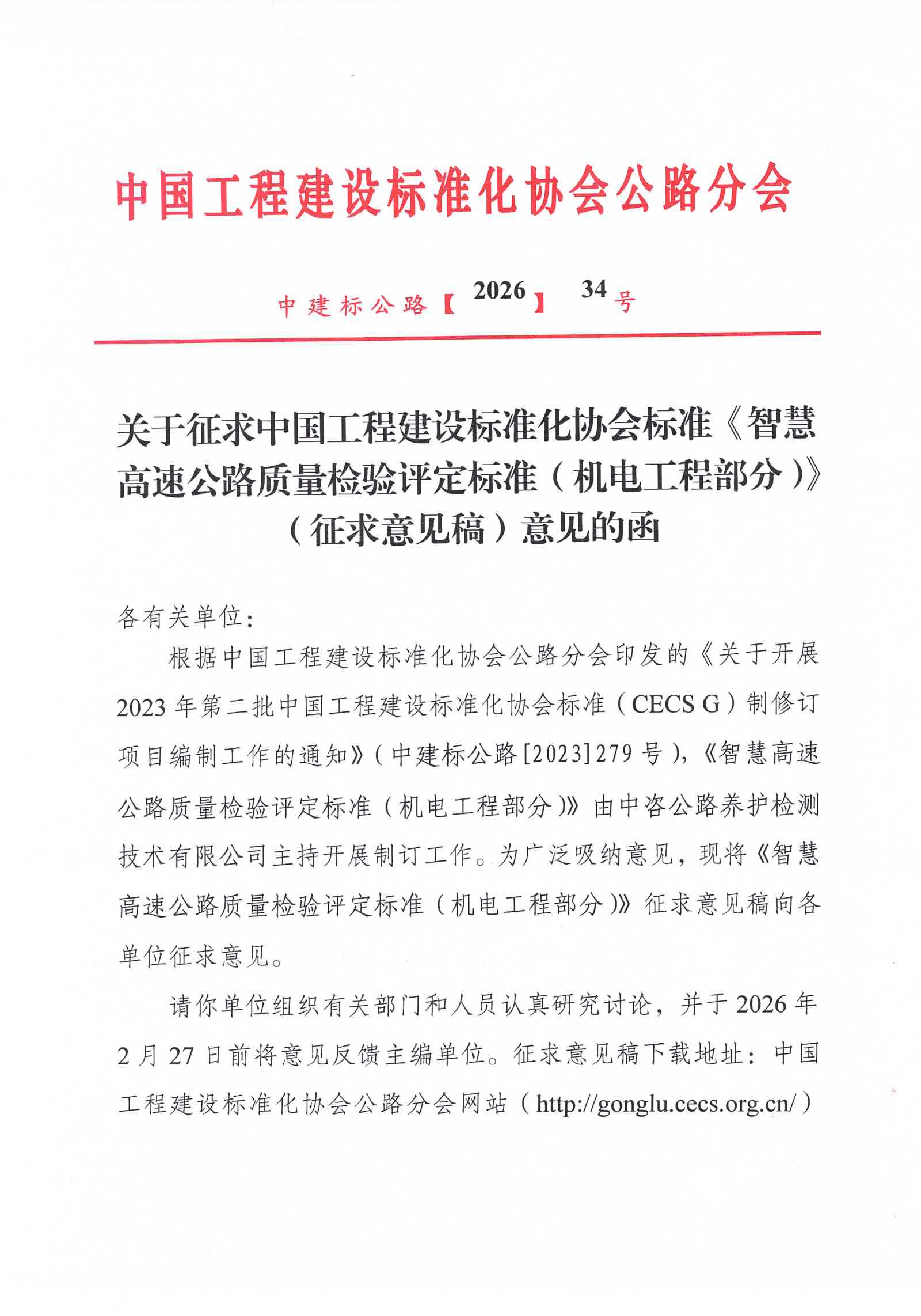 关于征求中国工程建设标准化协会标准《智慧高速公路质量检验评定标准(机电工程部分)》(征求意见稿)意见的函