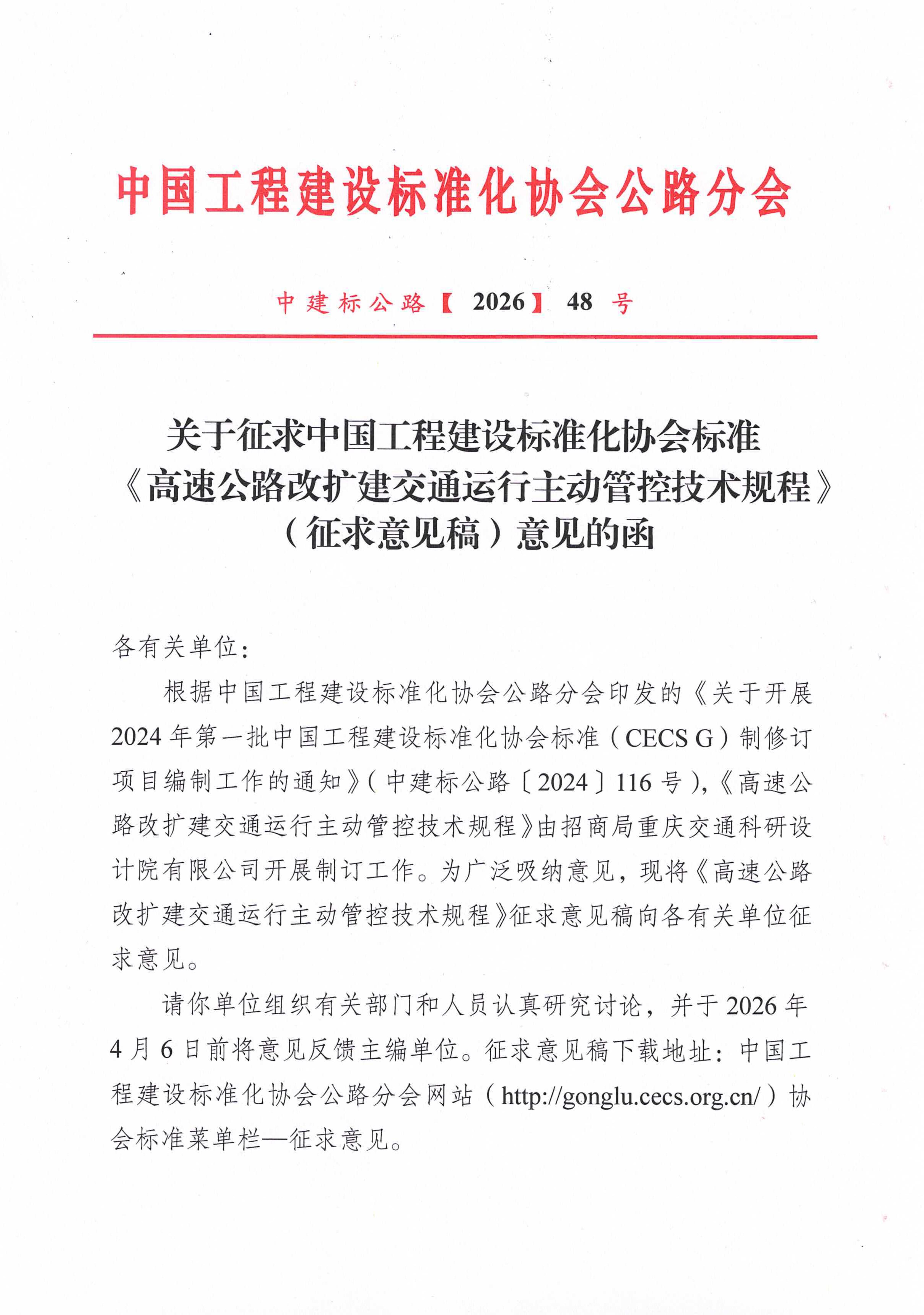 关于征求中国工程建设标准化协会标准《高速公路改扩建交通运行主动管控技术规程》(征求意见稿)意见的函