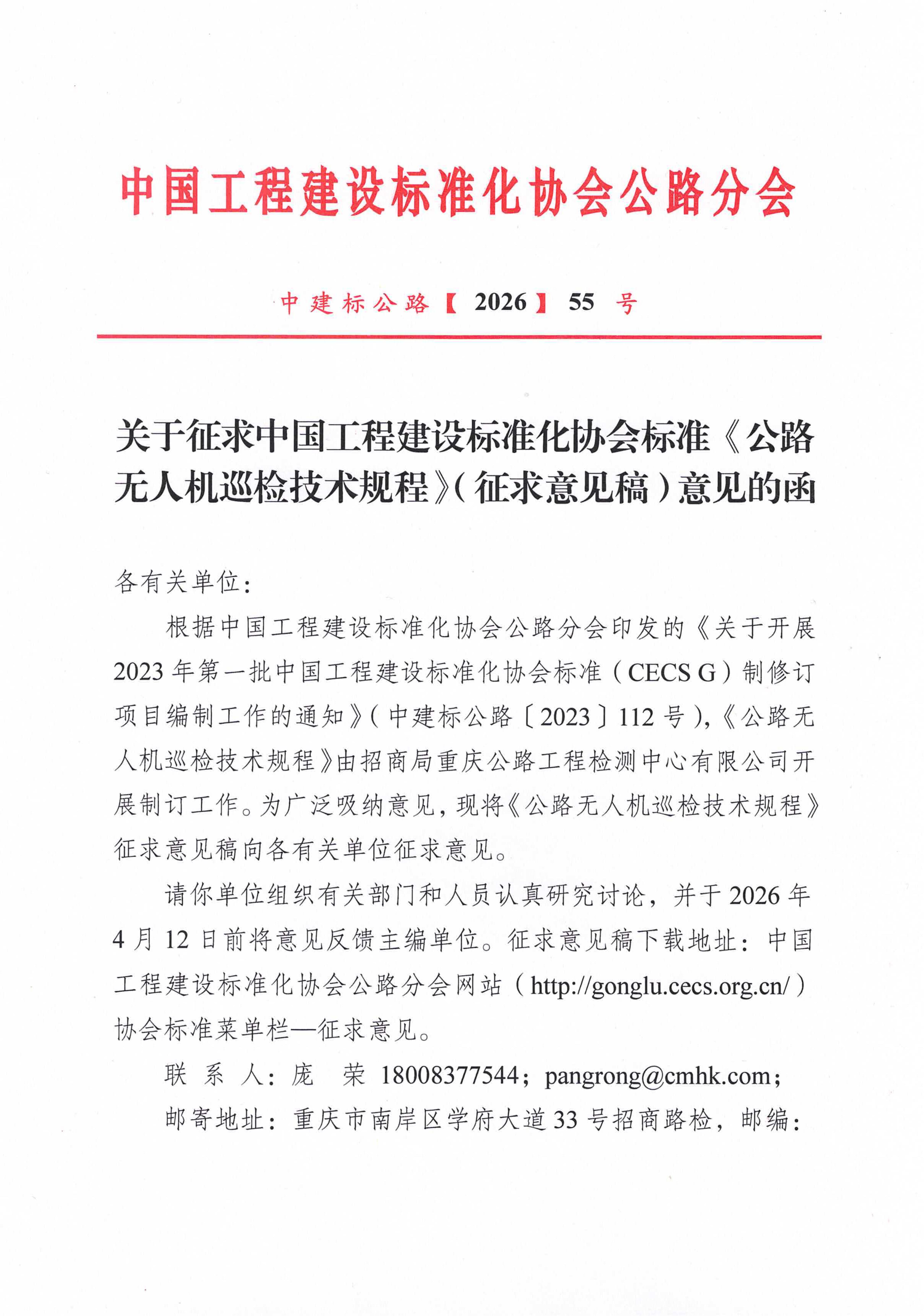 关于征求中国工程建设标准化协会标准《公路无人机巡检技术规程》(征求意见稿)意见的函