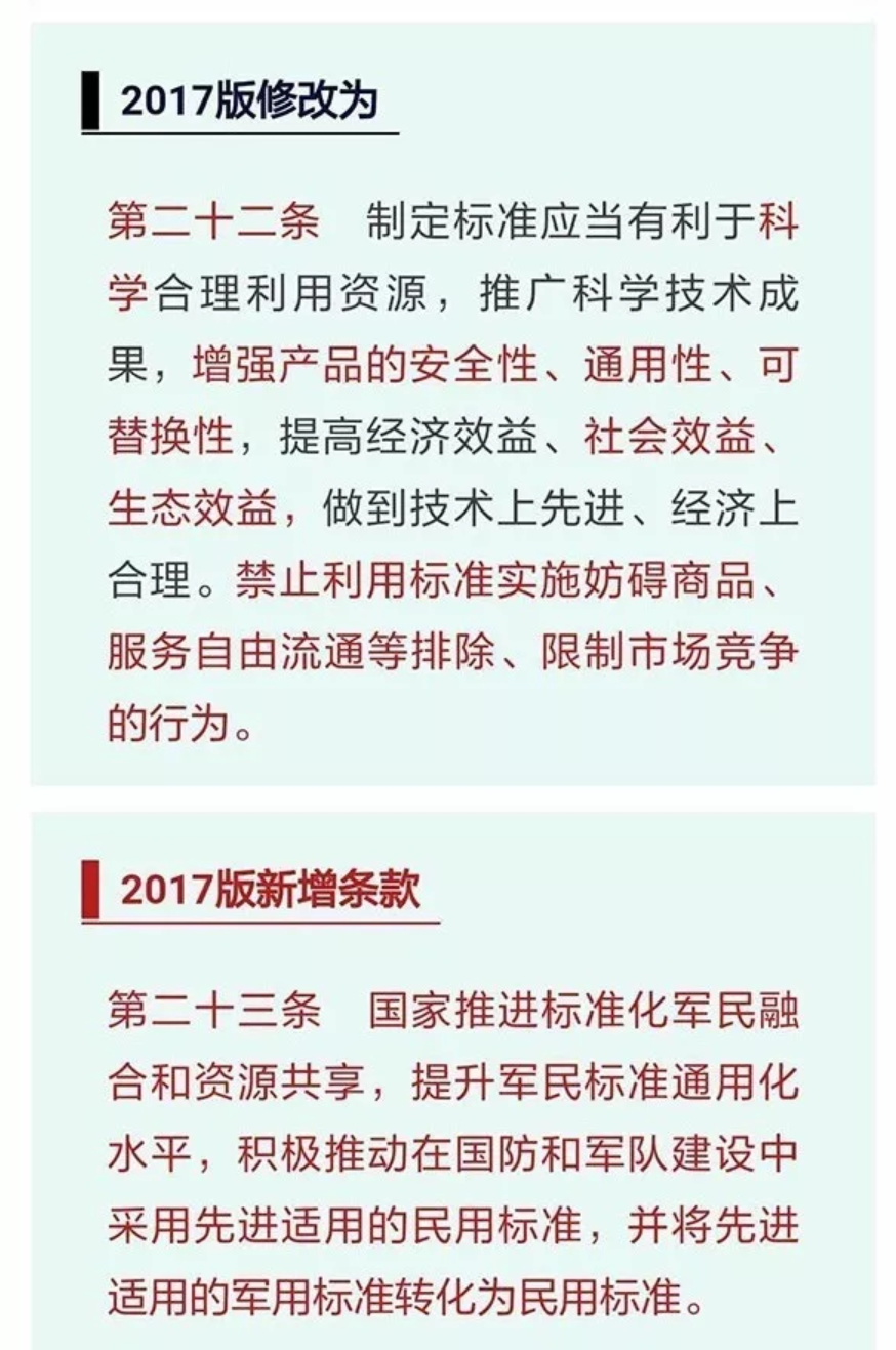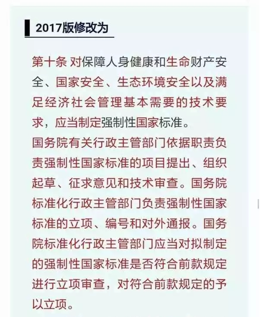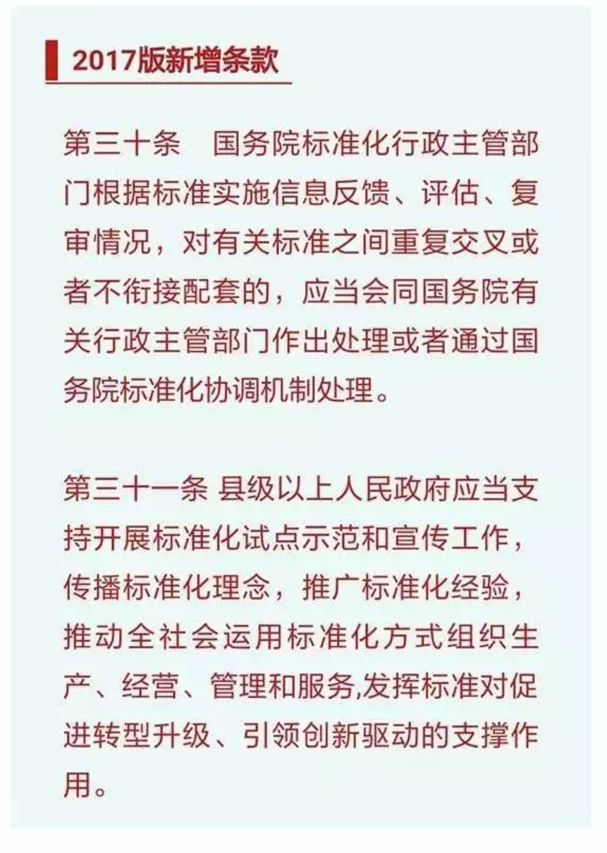十二届全国人大常委会第三十次会议于11月4日下午在北京人民大会堂闭幕。会议经表决,通过了新修订的标准化法。国家主席习近平签署第78号主席令予以公布。为了解新修订的标准化法(以下简称“2017版”)具体都做了那些修改,本文对2017版和现行标准化法(以下简称“1988版”)进行了对比梳理,供大家参考,具体内容如下。