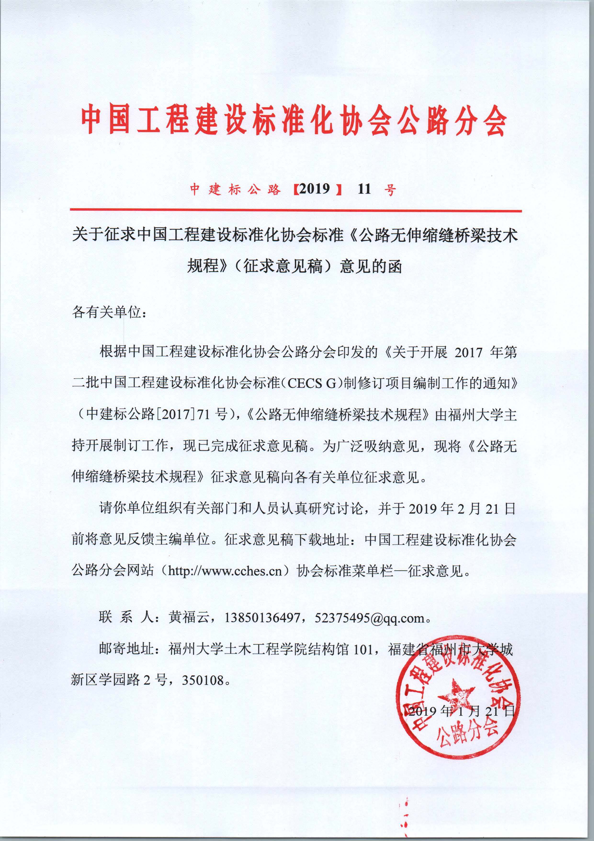 关于征求中国工程建设标准化协会标准《公路无伸缩缝桥梁技术规程》(征求意见稿)意见的函