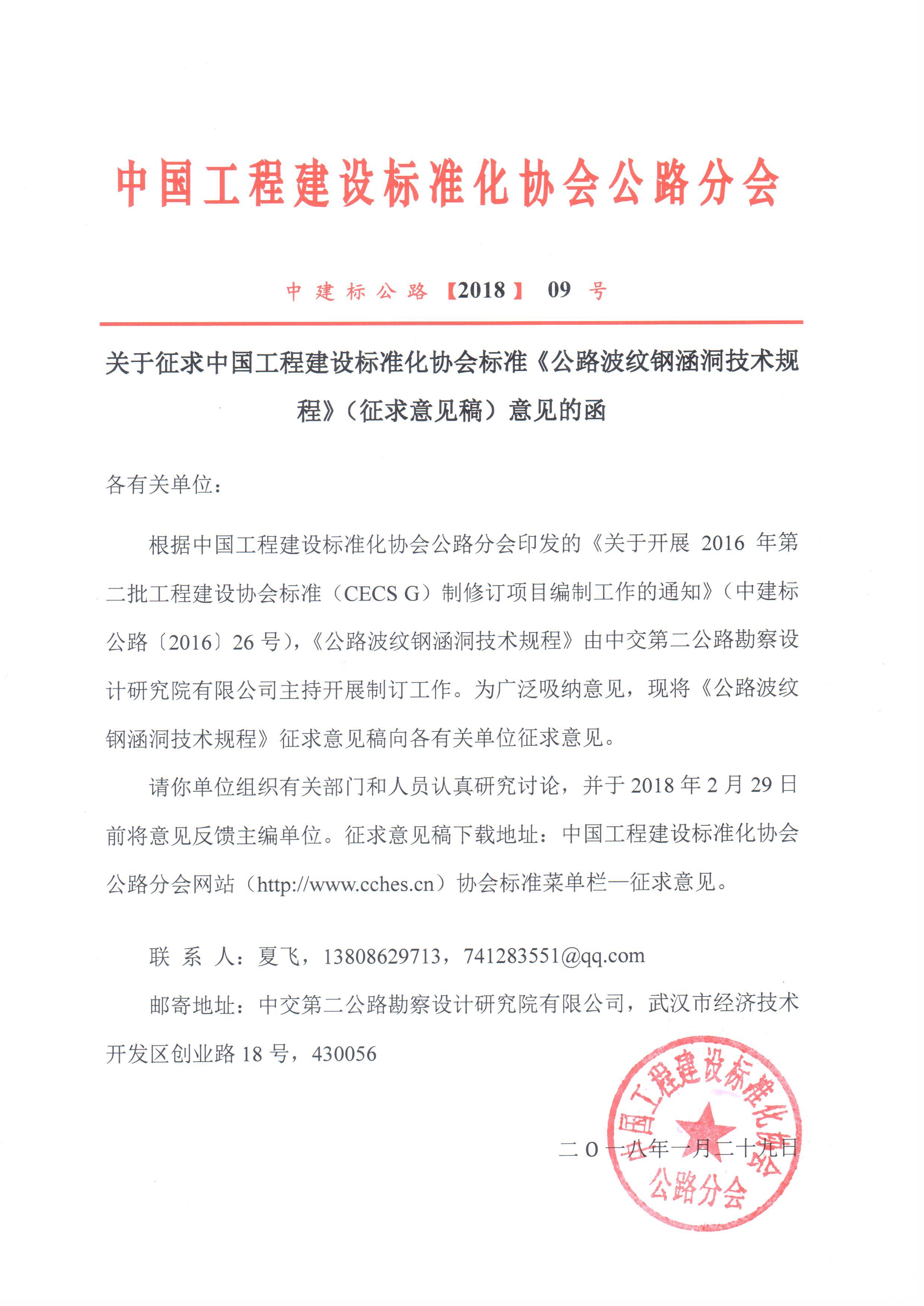关于征求中国工程建设标准化协会标准《公路波纹钢涵洞技术规程》(征求意见稿) 意见的函