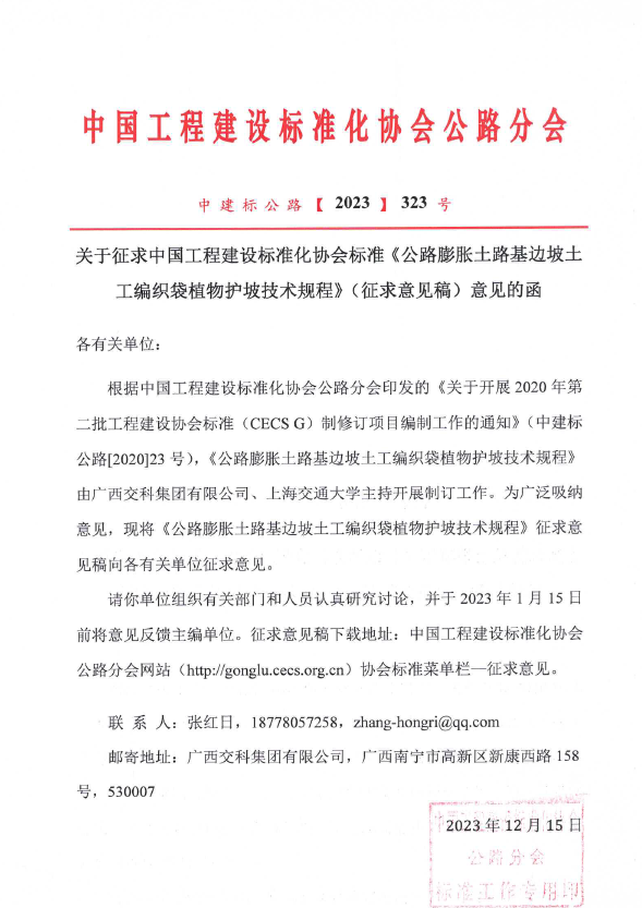 关于征求中国工程建设标准化协会标准《公路膨胀土路基边坡土工编织袋植物护坡技术规程》(征求意见稿)意见的函