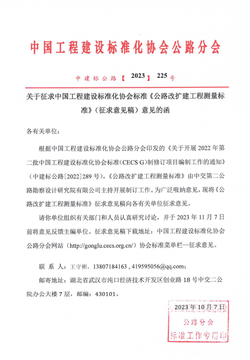 关于征求中国工程建设标准化协会标准《公路改扩建工程测量标准》(征求意见稿)意见的函
