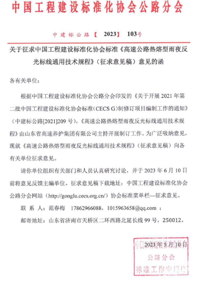 关于征求中国工程建设标准化协会标准《高速公路热熔型雨夜反光标线通用技术规程》(征求意见稿)意见的函