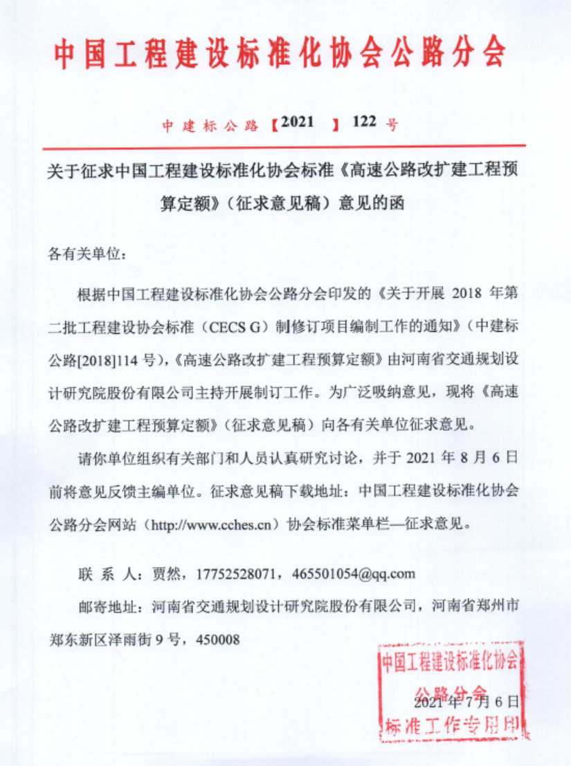 关于征求中国工程建设标准化协会标准《高速公路改扩建工程预算定额》(征求意见稿)意见的函
