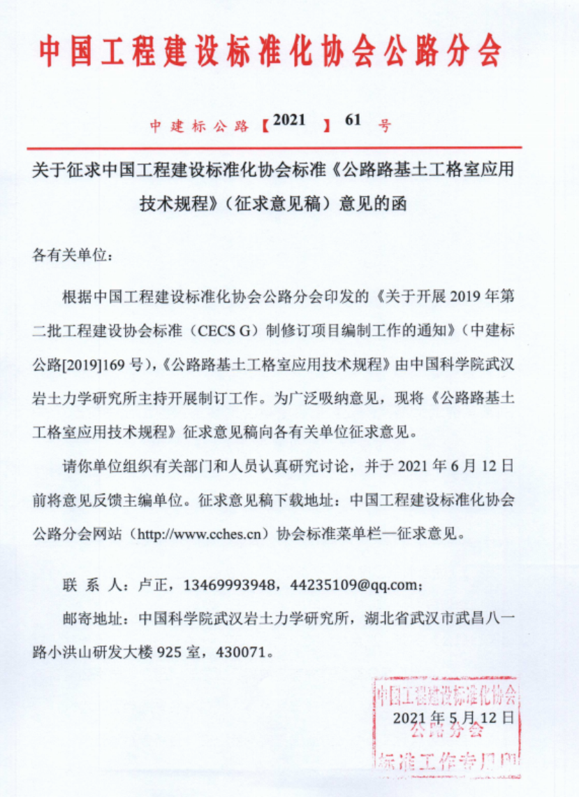 关于征求中国工程建设标准化协会标准 《公路路基土工格室应用技术规程》(征求意见稿)意见的函