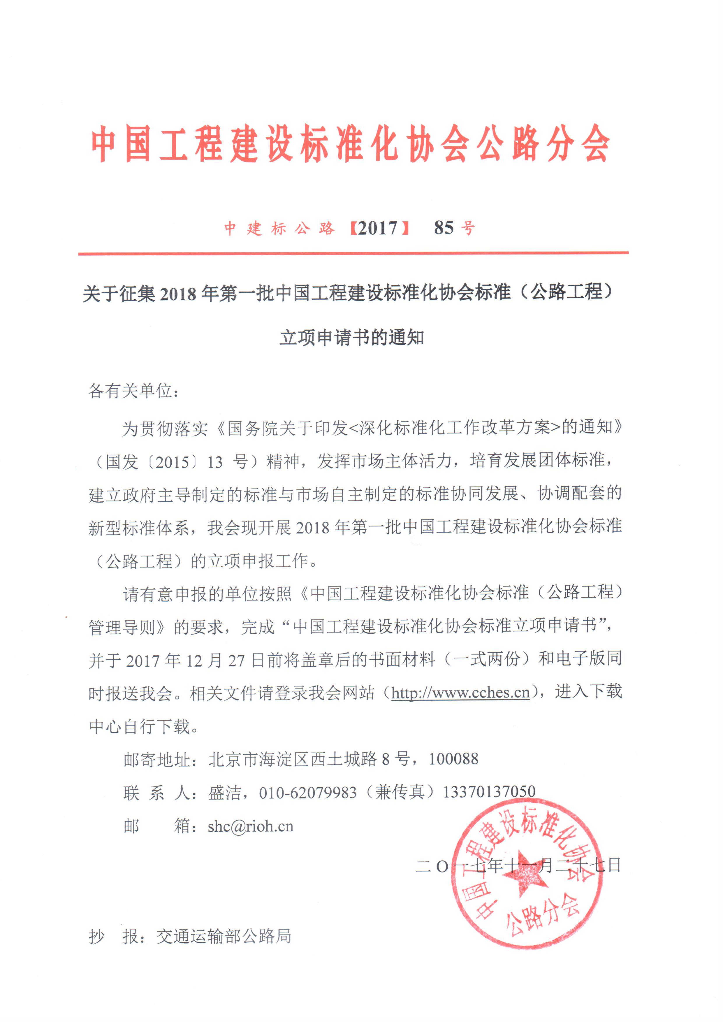 关于征集2018年第一批中国工程建设标准化协会标准(公路工程)立项申请书的通知